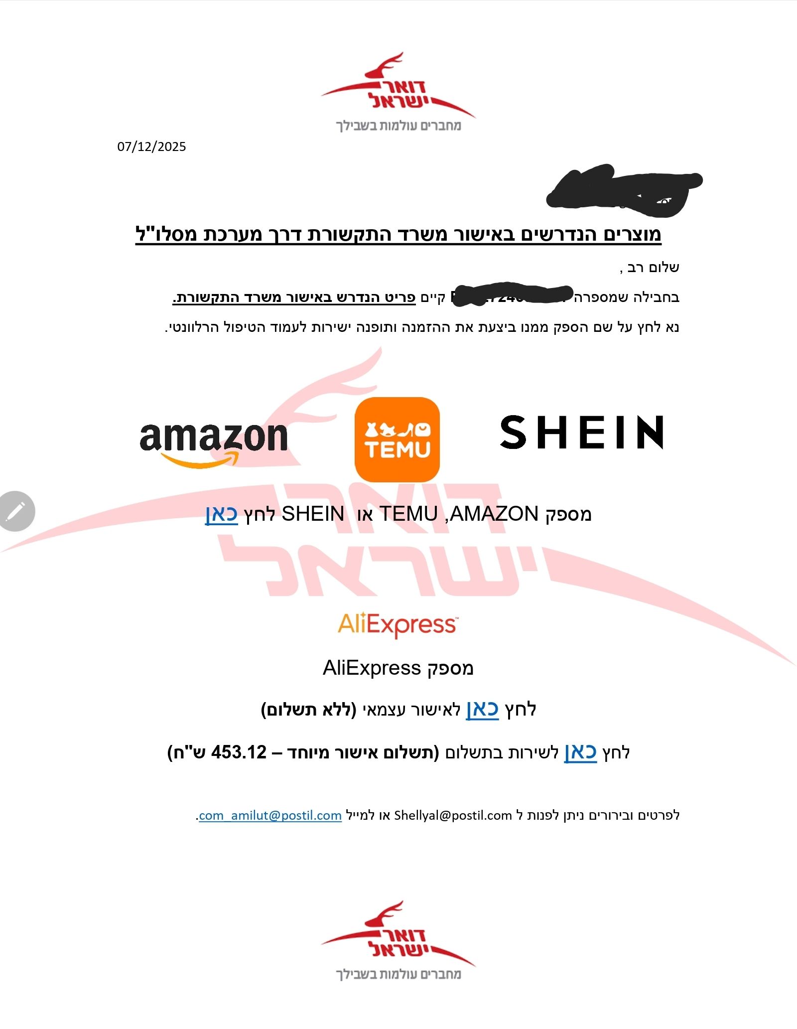 היום קיבלתי הודעה מדואר ישראל ואני בהלם