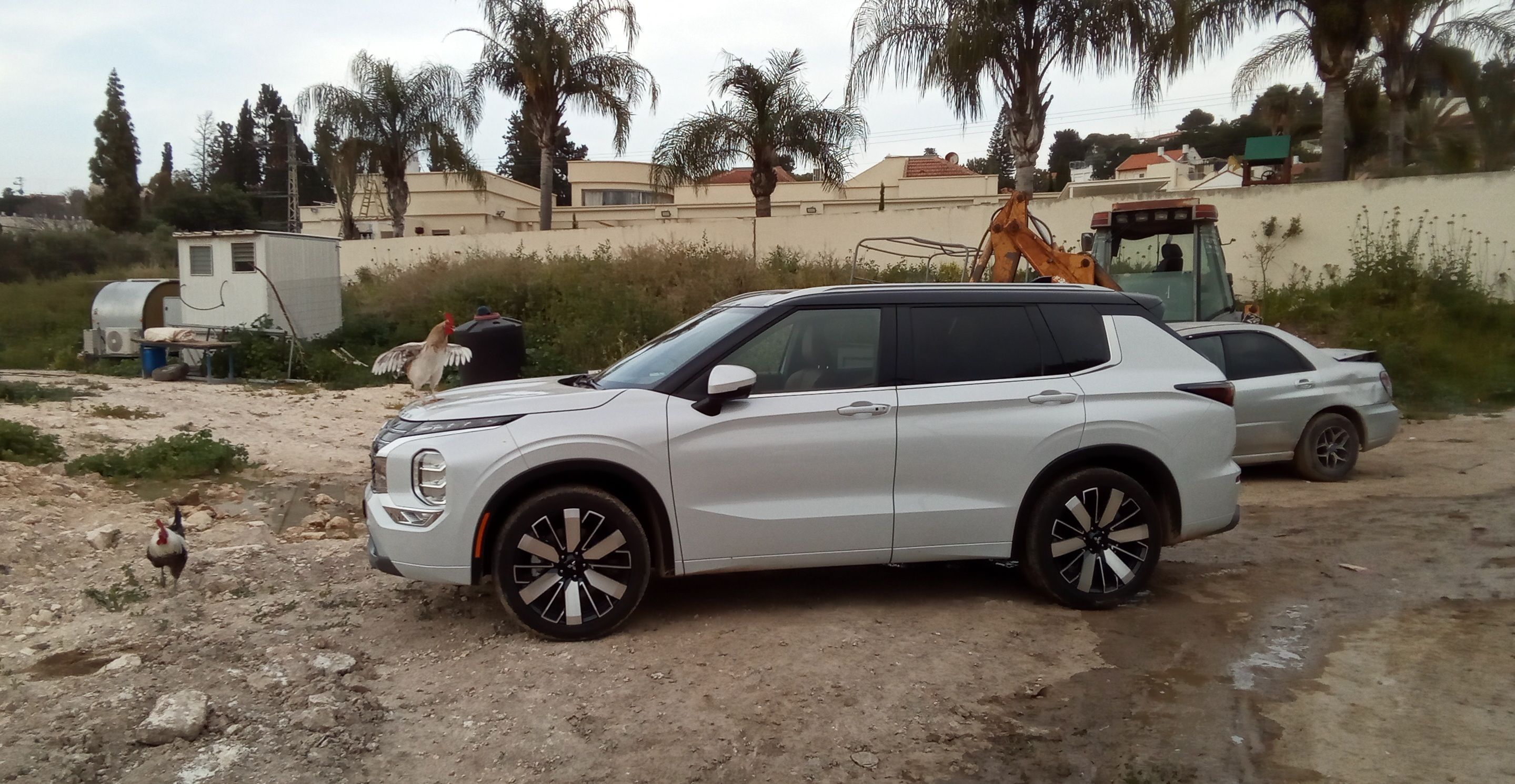 תרנגול שהתלהב מהרכב נעמד בחזית ועושה פוזה בצורת הסמל של מיצובישי.